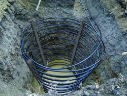 Cesta geotérmica, de 2 m de altura, formada por tubo de polietileno reticulado (PE-Xa) de 32 mm de diámetro y 2,9 mm de espesor, SDR11, de 150 m de longitud, dispuesto en forma de bucle. |