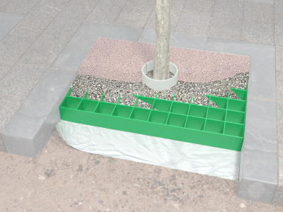 Jardinera de infiltración formado por geotextil de polipropileno, (120 g/m²), rejilla alveolar de polietileno de alta densidad estable a los rayos UV, de 73x73x7 cm, color verde y relleno de las celdas con grava filtrante sin clasificar, para tráfico peatonal, con una resistencia a flexotracción de 3 N/mm², una resistencia a compresión de 6 N/mm² y una capacidad drenante >=150 l/(m²·min), resistencia al deslizamiento alta.
