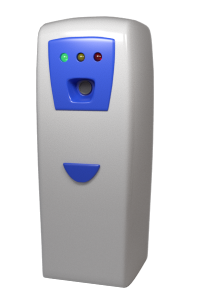 Dispensador ambiental electrónico, con pulsador on/off, led indicador de carga de aerosol, led indicador de batería y sensor de luz, de polipropileno blanco y azul, de 240x86x85 mm.