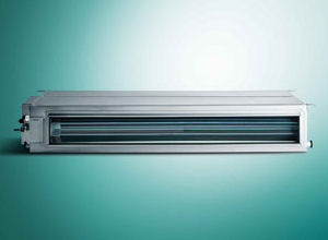 Equipo de aire acondicionado, sistema aire-aire split 1x1, modelo climaVAIR plus VAI 1 050 DN "VAILLANT", para gas R-32, alimentación monofásica (230V/50Hz), potencia frigorífica nominal 5 kW, potencia frigorífica mínima/máxima 1,6/5,5 kW, consumo eléctrico en refrigeración 1,55 kW, SEER 6,1 (clase A++), potencia calorífica nominal 5,5 kW, potencia calorífica mínima/máxima 1,5/6 kW, consumo eléctrico en calefacción 1,45 kW, SCOP 4 (clase A+), formado por una unidad interior de techo con distribución por ducto rectangular de baja silueta VAI 1-050 DNI, presión sonora mínima/máxima 36/43 dBA, dimensiones 200x1000x450 mm, peso 26 kg, mando a distancia, y una unidad exterior VAI 1-050 KDNO, con compresor tipo Inverter DC, presión disponible ajustable, presión sonora 53 dBA, dimensiones 596x818x302 mm, peso 39 kg, diámetro de conexión de la tubería de gas 1/2", diámetro de conexión de la tubería de líquido 1/4", con amortiguadores de muelles, soportes y fijaciones de las unidades interior y exterior, bomba para elevación de condensados, conexión frigorífica entre unidades, conexión eléctrica entre unidades, sujeción y protección mecánica de los tendidos de líneas con ocultación bajo canaleta modular en zonas vistas. Incluso elementos antivibratorios y soportes de pared para apoyo de la unidad exterior y elementos para suspensión del techo para la unidad interior.